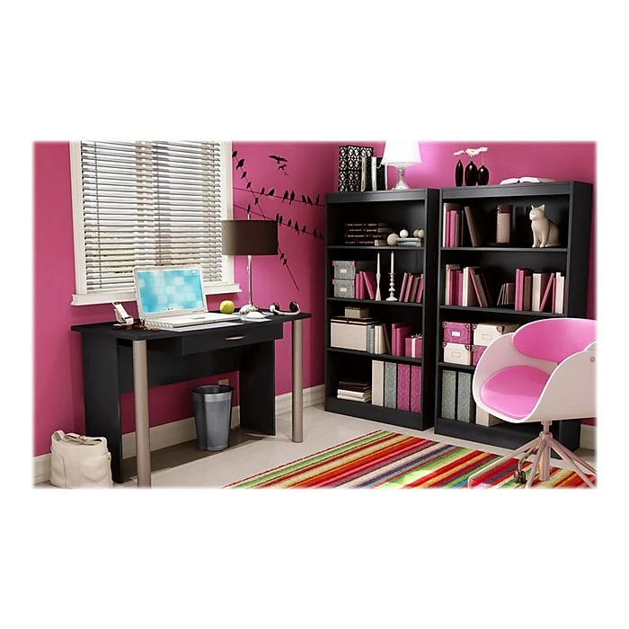 Create an attractive display area with this black bookcase. The laminate particleboard construction offers a sturdy mount for hardcover collections, figurines or photo frames, and the four open shelves provide easily accessible storage space. This South Shore Work ID bookcase has a sleek, contemporary style that fits any home or office space.