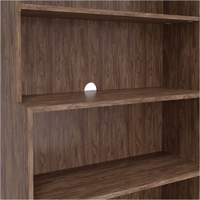 Personalize your office while enjoying increased functionality with this espresso bookcase. The five-shelf design provides ample space for books, family portraits and office supplies, while the center shelf features a grommet for cable management, letting you neatly position electronics and keep cords out of sight. This Union & Scale⢠Essentials five-shelf espresso bookcase has a sleek modern appearance that works well with other pieces in the line.