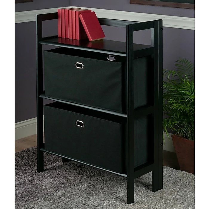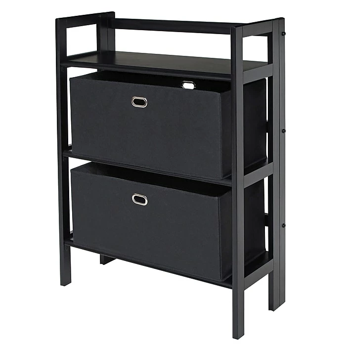 This 2-Tier Foldable Shelf is made of Solid Wood and finished in Black. The matching foldable baskets are constructed of sturdy fiberboard with Black fabric. Carrying them is easy and secure with metal ring handles. Two units can be stacked to provide additional vertical storage space.